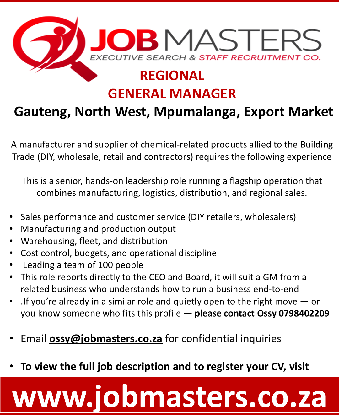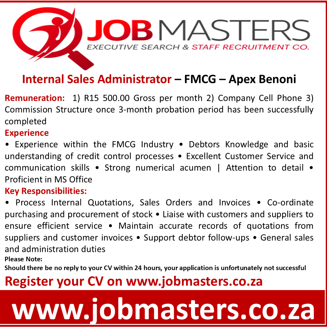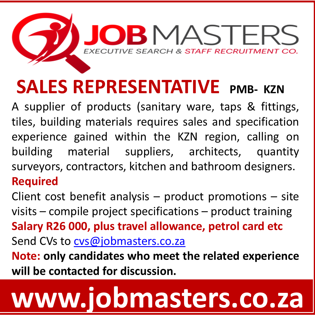 A supplier of products (sanitary ware, taps & fittings, tiles, building materials etc) requires sales and specification experience gained within the KZN region, calling on building material suppliers, architects, quantity surveyors, contractors, kitchen and bathroom designers. Client cost benefit analysis – product promotions – site visits – compile project specifications – product training