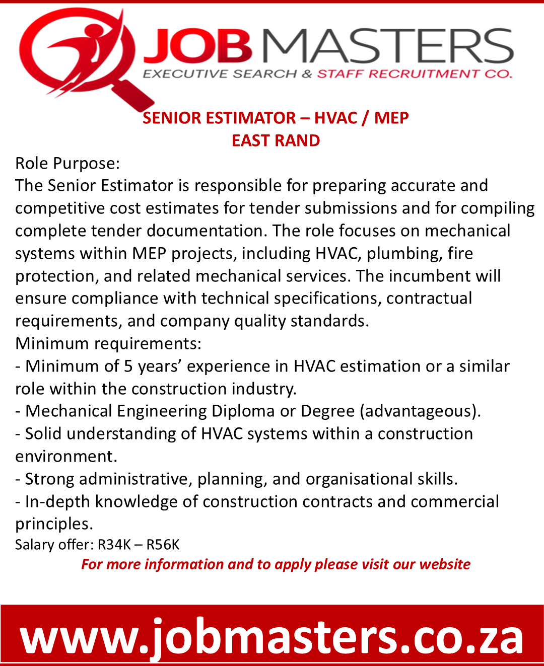 Role Purpose: The Senior Estimator is responsible for preparing accurate and competitive cost estimates for tender submissions and for compiling complete tender documentation. The role focuses on mechanical systems within MEP projects, including HVAC, plumbing, fire protection, and related mechanical services. The incumbent will ensure compliance with technical specifications, contractual requirements, and company quality standards.