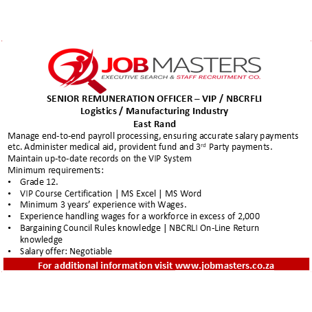 This role manages end-to-end payroll processing, ensuring accurate salary payments, authorized deductions, and compliance with company and statutory requirements. It includes administering medical aid, provident fund contributions, and third-party payments, along with maintaining up-to-date records in the VIP system.