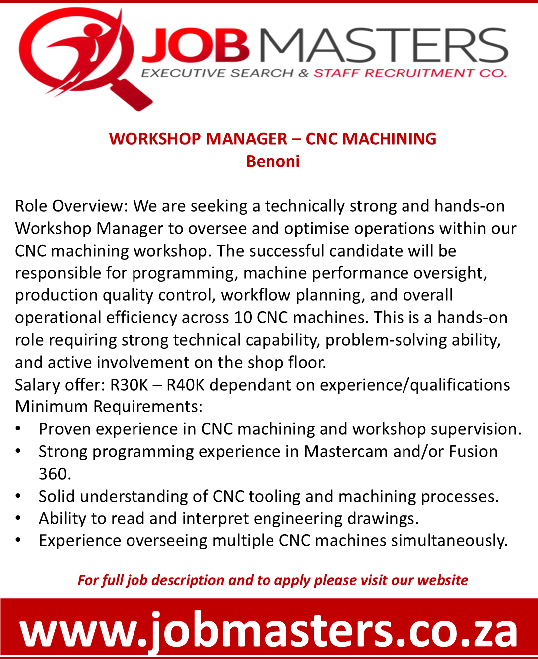 The position is based in Apex Benoni, the salary is negotiable depending on skills and experience for the position (R10 000 to R20 000)