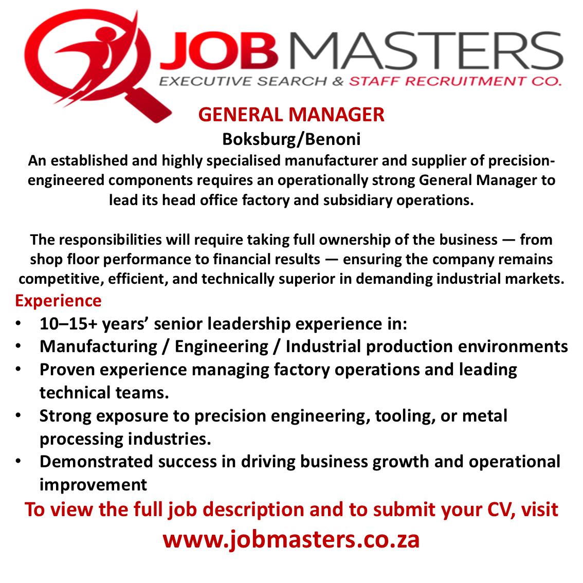 · National Diploma or Degree in Mechanical Engineering, Industrial Engineering, or related field (advantageous).
